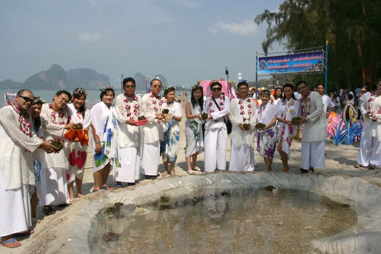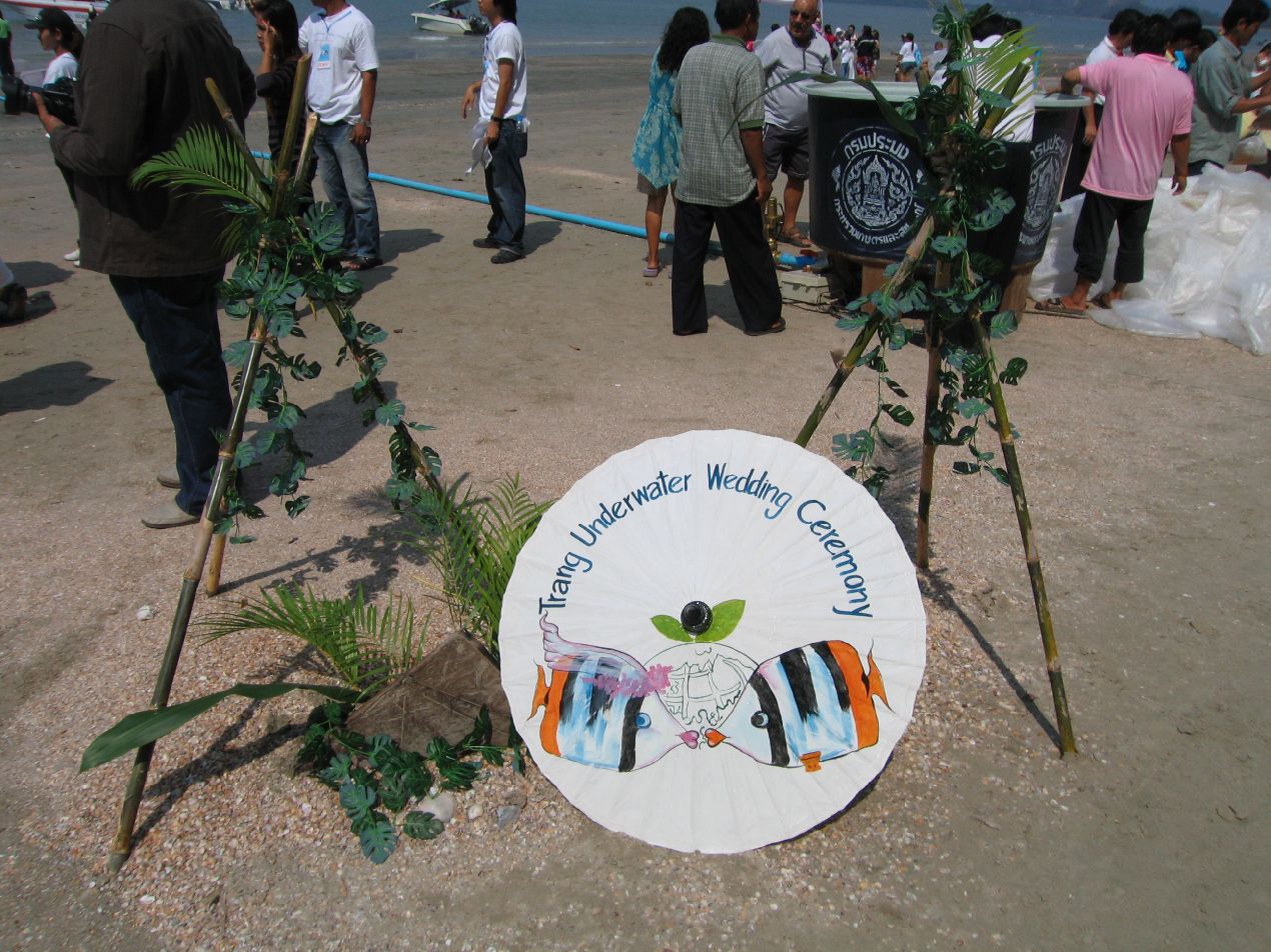 | トランでは毎年2月14日バレンタインデーに、海中結婚式というイベントがある、今年は13回目でタイ内外から30数組の参加だそうだ。 |