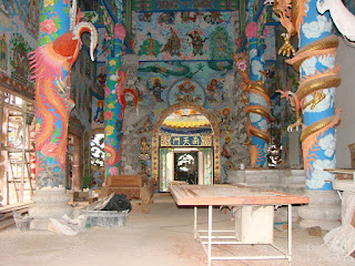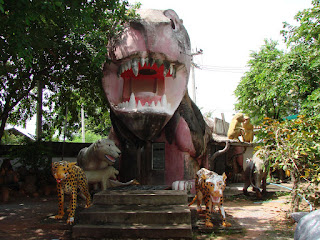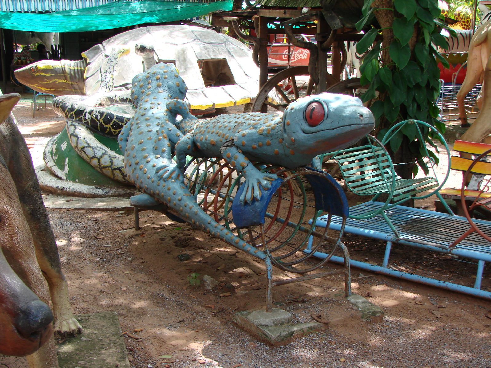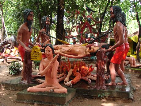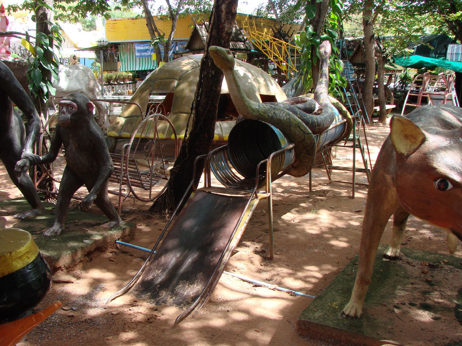 | このお寺の一角に幼稚園だか保育園だかがあるのには驚いた、タイのお寺に学校があるのは珍しくはないが、地獄を毎日見て育つ子供ってのはどうなんだろうか? 遊具もなかなかユニークだし、裸のお姉さんたちもいて、皆いい子に育ちそう。 | ||