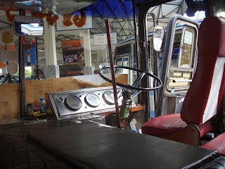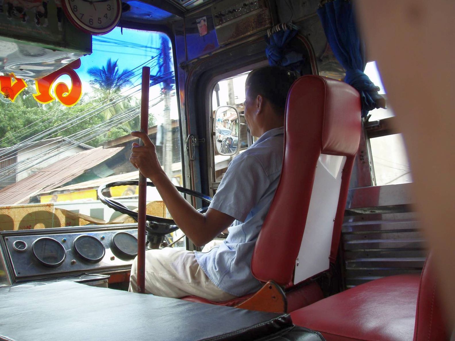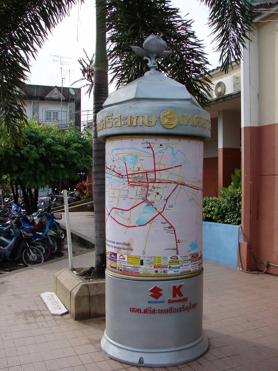 シーサケット駅前にあった案内図、いつからか(多分1・2年前)こんな形の案内図が各地に設置されるようになった、基本的な形は同じだが色や上部のシンボル(?)が各県か各都市で違うようだ。翌7日、シーサケットバスターミナルから普通バスでウボンまで乗った、そのバスのシフトレバーの長いこと、一瞬、棒が立てかけてあるのかと思った。 杖をつきながら運転しているみたいでしょ。 | ||