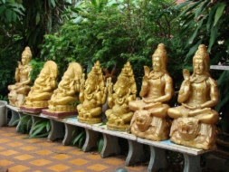上記の門がなぜコーラートのシンボルなのか知らないが色々な所に使われている、お寺は、ちょうど泊まったホテルのまん前にあったので、ブラブラ行って見た、小坊主が洞窟があるって言うんで地下にでも潜るのかと思っていたら、人工的に作られた物、鍾乳石だのはサラブリの洞窟から持ってきたと言っていた。 市内観光バスはホテルのあんちゃんが、タオ・スラナリー像の前から20バーツで乗れるっていうんで、行ってみたが人が集まればの話で、一人では300バーツだそうだ。 | ||