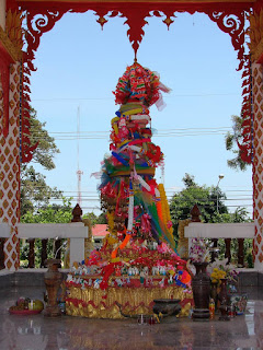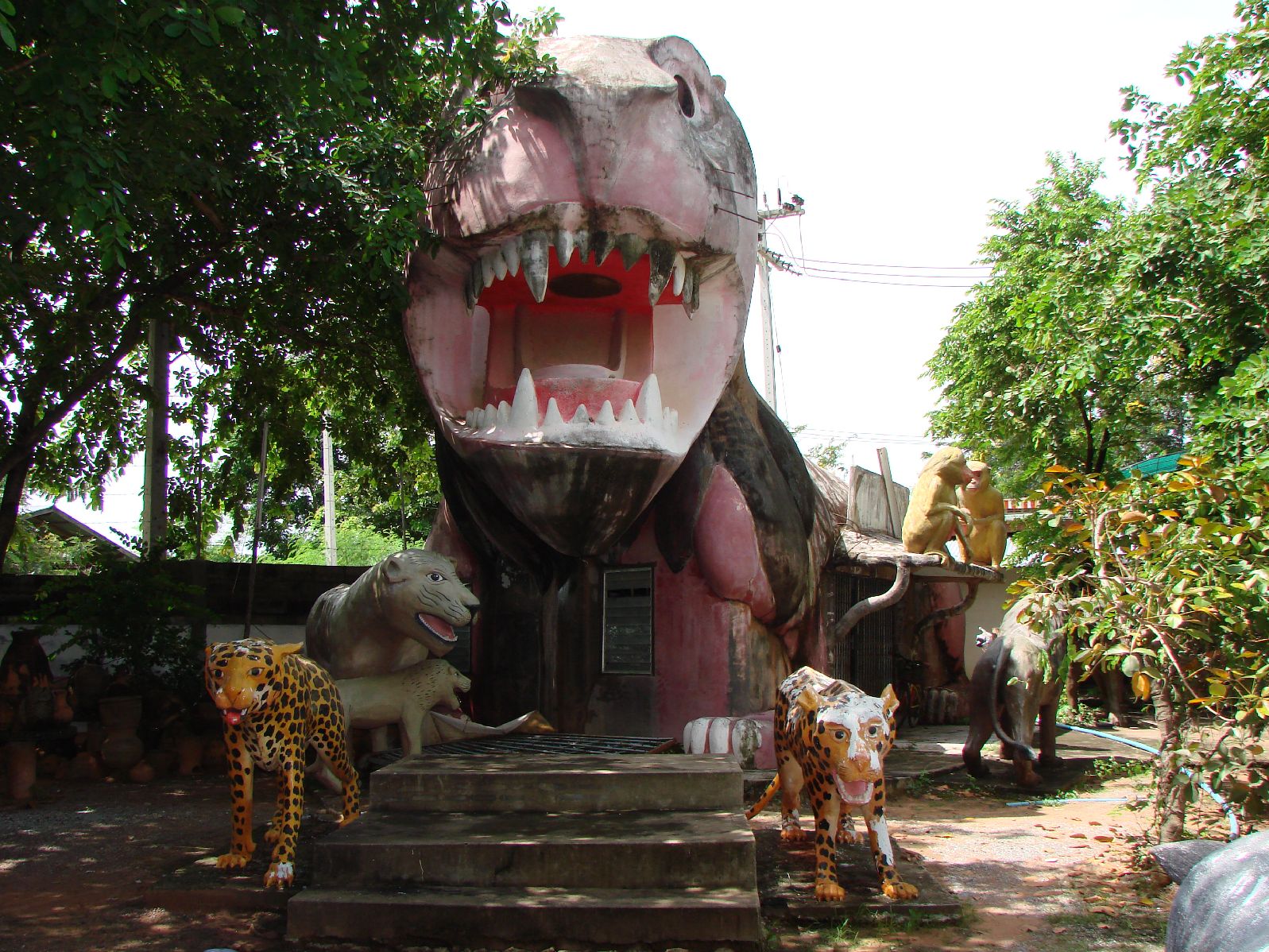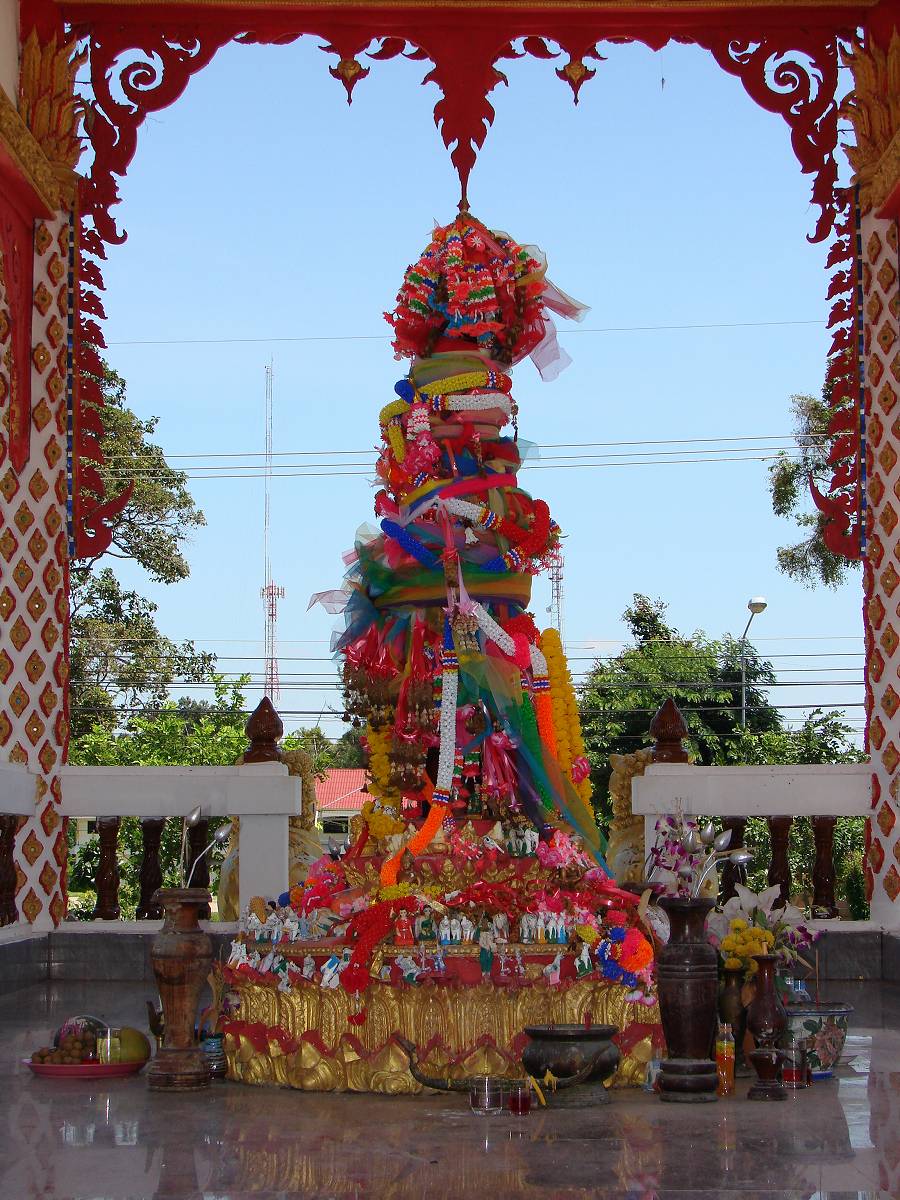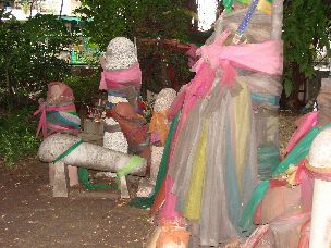 | ここにはそんな市内観光に来たんじゃなくて 上記のお寺が目的、名前は「ワットパーラックローイ」、 行き方は新バスターミナルからノーンタイへそこからトゥクトゥクかモーターサイでとの事、バスターミナルでノーンタイを聞いてみるとバスターミナルの左奥のチャイヤプーム行きだそうだ、バスナンバーの頭に「K」の付くこのバス会社(名前は忘れた)のバスはお寺への道から3Kmほど過ぎたノーンタイの町で止まり、そこにはトゥクトゥクかモーターサイがいる、お寺の入り口で降りてもいいのだが、そこからは1.5Kmと看板にあり、トゥクトゥクもモーターサイもいる可能性は少ない、私も帰りの足がなく、食堂 にいたあんちゃんにバイクで入り口まで20Bで送ってもらった。 | ||