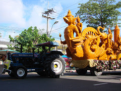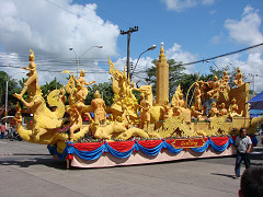 | 5・6月は特別な事もなくトランでゴロゴロしていただけで終ってしまった。 あまりにも退屈なので、ウボンのローソク祭りを見にイサーンに行く事にした。 トランから夜行寝台(ブルートレイン)でバンコクへ、そこからバスでウボン方面へ行くことにする、政府観光局のHPでは7日がライトアップで、パレードが8日となっているので、 7日にウボンに入る事にし前日はシーサケットに泊まる。 | ||