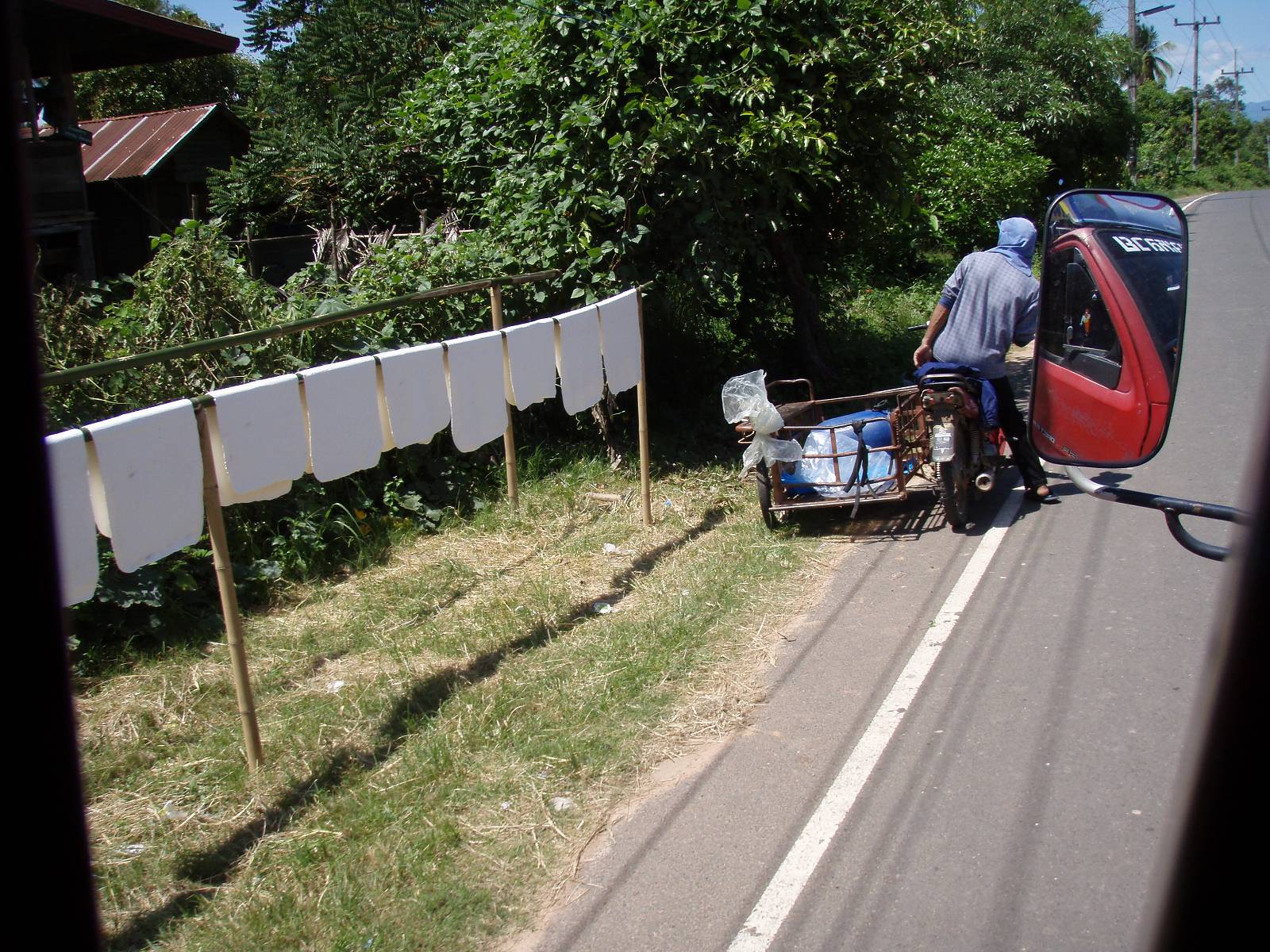 ウボンの東にコンチアムと言う所がある、ここはメコンとムーン川の合流点でメー・ナム・ソン・シー(2色川)で有名な所だ。 コンチアムに連れて来てもらった事はあるが自力で来るのは初めてなので、ピブンからのソンテオの運ちゃんに着いたら知らせてくれるように頼んだのにすっかり忘れて30Kmも先まで運ばれてしまった、ピブンへのソンテオはもう夕方までないとの事、夕方まで待つしかないのか、と、ガッカリしている所に村長が現れて300Bでコンチアムまで送るがどうする?という事になった、夕方まで待ってコンチアムに泊まっても同じようなものだろうから送ってもらう。 | ||
