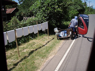 ![]() ウボンからデット・ウドムで乗り換え、ナーチャルアイまで、途中意味もなく(?)長時間停車などしてチンタラ走って来たがまあまあ順調、ナーチャルアイで例の如くどこへ行くんだやら聞いてくるおじさん達にチョンボックの国境の事を尋ねる、往復している交通機関はなし、宿泊施設はあるらしい、しかしそのあたり一帯は軍が管理しているので行くには軍の許可が必要、でもややこしいものではなく口頭で「入れてください」「はい、どうぞ」で軍人が案内してくれるそうだ、ここまで来たからには車をチャーターしてでも行かなきゃなんないでしょ、600B( 片道40数キロの往復)は痛いけど、まあ3歩で三カ国周遊もしくは三カ国上に立つって事はなかなか出来ることではないし。 | ||