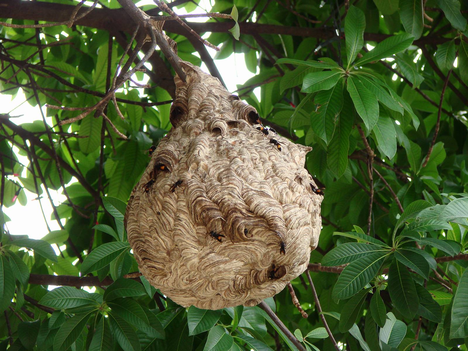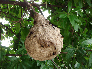 | 上記のお寺の反対側にもお寺があるので入って見るが、ここは全く何もない、砲丸木(タイ語でサーラーランカーと言って沙羅双樹と間違われるようだ)が花と実をつけているのが目についたので近寄ってみると、とんでもないものが !、地上2m程の所に蜂の巣、日本ならとっくに駆除されているだろう。 砲丸木、面白い名前だが「実」を見るとなるほどと思う。 | ||