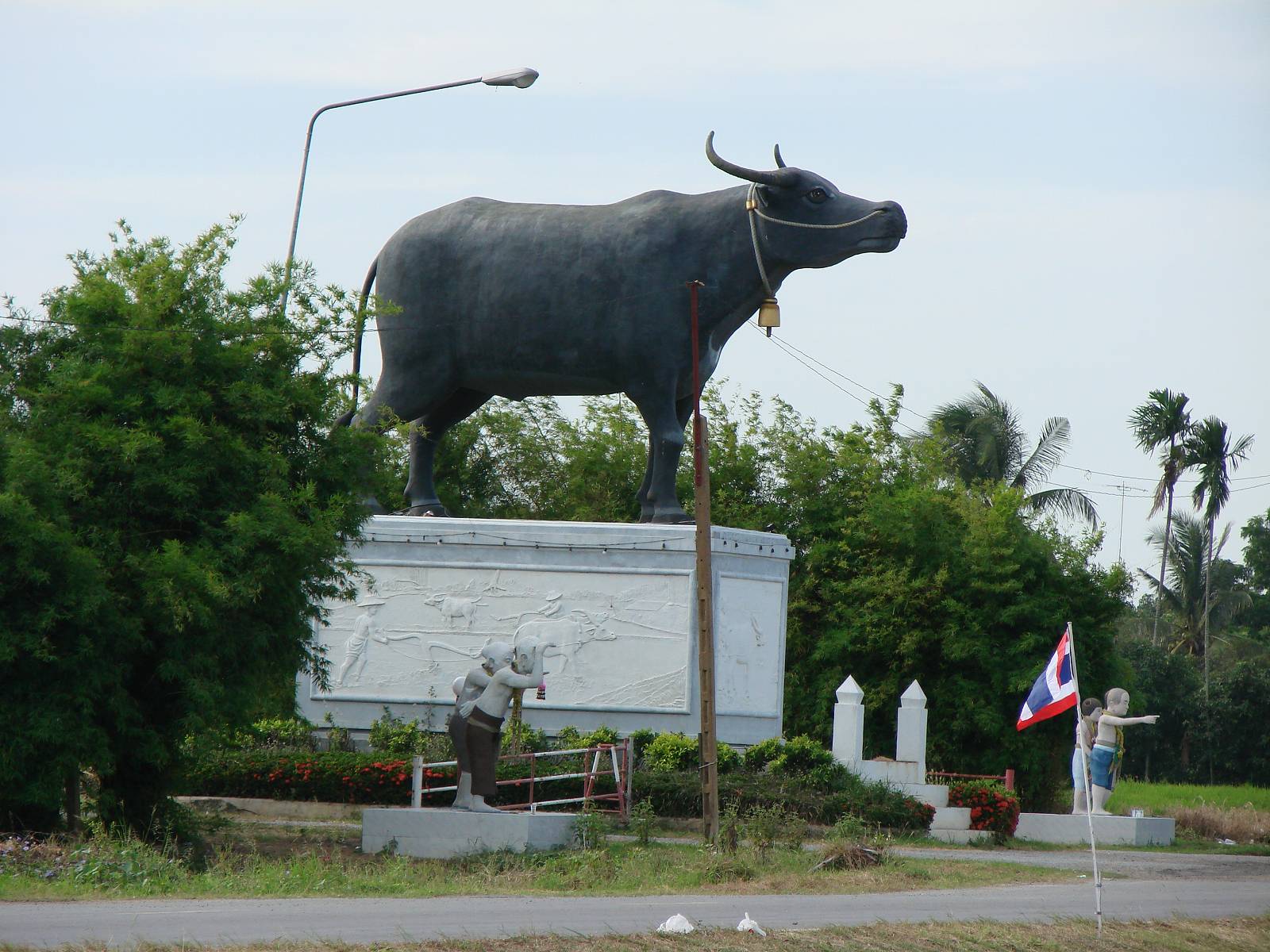 Don Chedi Monument、340号線にあった「牛に注意」標識と水牛像