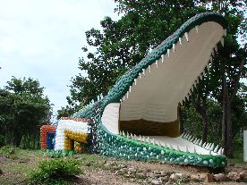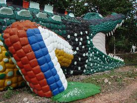 | ここのワニはピチットの公園のワニと違ってカラフル、どうしてここでワニなのかは知らない、近くにデカイ犬もいた。 |