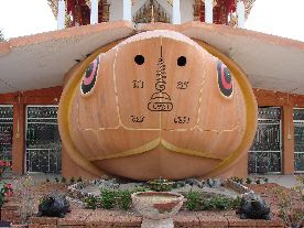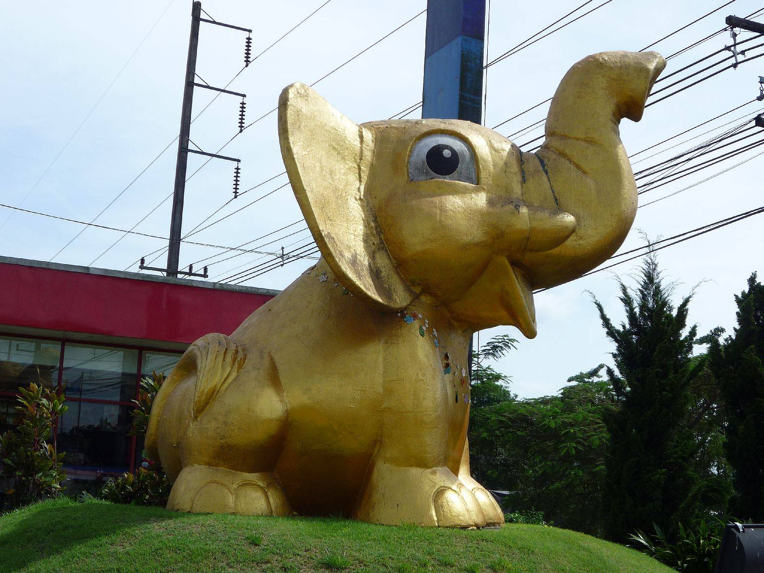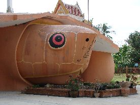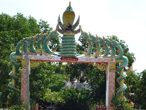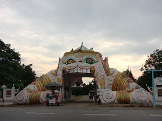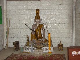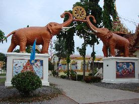 下のWat Tha Sung Thaksinaramへ行こうとしたのだが、反対側へ曲がってしまい、遠くから門が見えたので入ってみた、変わった物といえばこの門と象さん、この象さん、お腹の中を通って上に出られるようになっている、狭いけど。 |
