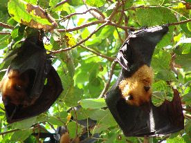 夜飛び回るコウモリと違って、昼間木の実なんかを食べているらしい、お寺の境内じゃなくて付近の木にぶら下がっていてもよさそうだが、友人曰く「うまい」と言うので、安全な境内にいるのかも。 |
