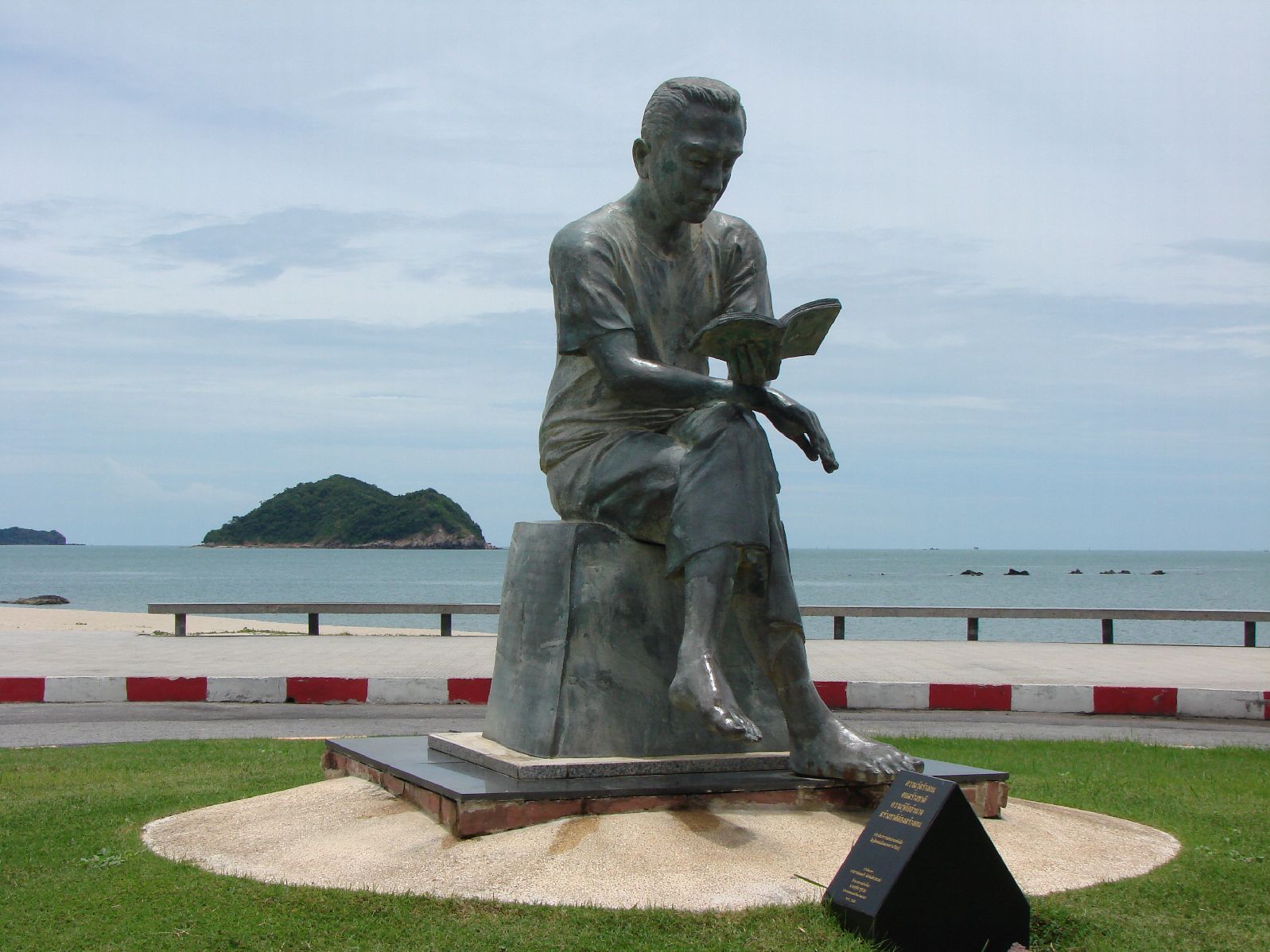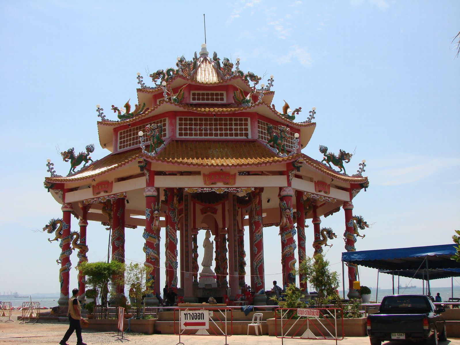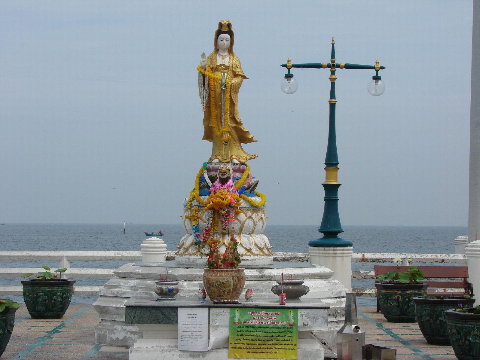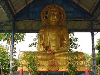 シーラチャからバンコクへの帰りにバンセンのお寺に寄る事にした、聞いてはいたが行った事はない、バイタクのアンちゃんに行き方を訊いていたら、丁度来合わせたバスで行けと言う、車掌にも言っておいたんだが、降ろされたのは幹線道路の何だら市場(名前は忘れた)、ここからはソンテオで行くらしい、助手席に乗れと言う運ちゃんの指示どうり助手席に座り、日本の事柄に付いての質問に答えているとちゃんとお寺の中まで送ってくれた。 |