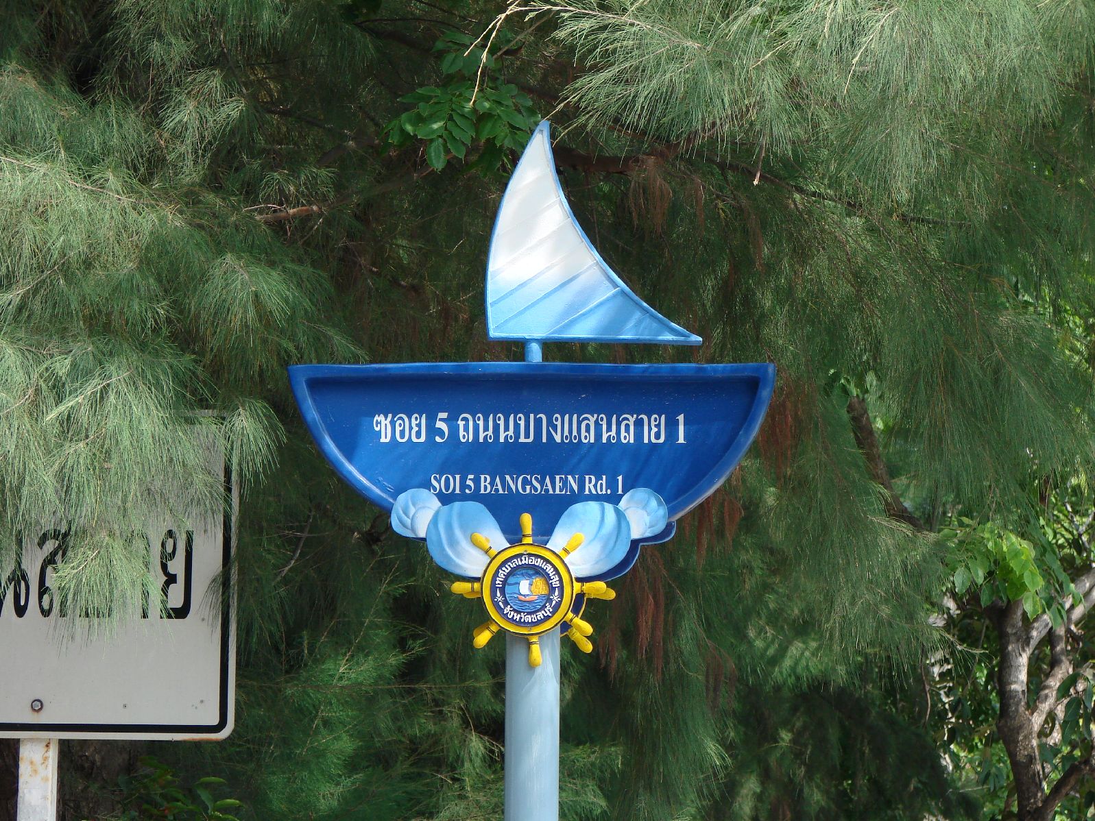 | バンセン・ビーチの道路標識はヨット、ごみばこはタツノオトシゴだった。 |