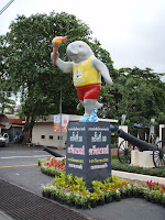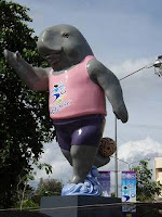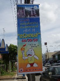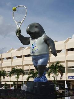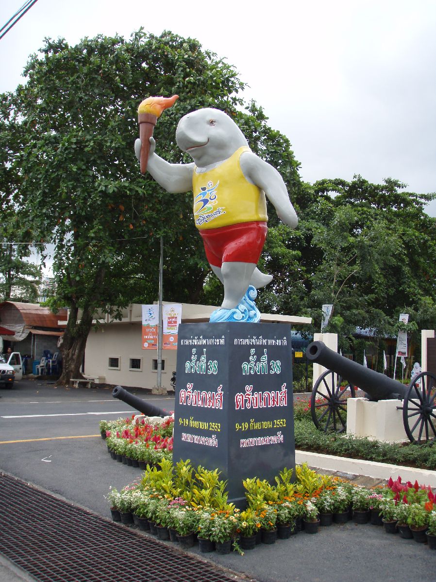 Games」、毎年各県で催されるスポーツ大会、第38回はここトランで開催される、開催日は2009年9月9日から、タイ人が大好きな9が並ぶ、当日9時9分には盛大な花火、って十分考えられるな、19時9分かも。 って事で、競技場の入り口で何かやってると思っていたら、出来てきました、金色のやつ先頭にジュゴンが競技してます、でも球技ばっかり、トランにはここのほかにもう一箇所競技場があって、そちらにはプールやら射撃場があるので、そちらでもジュゴンが他の競技してるのかも、見に行ってみよう。 | ||