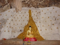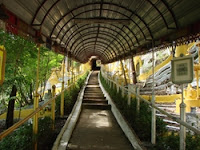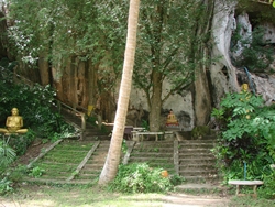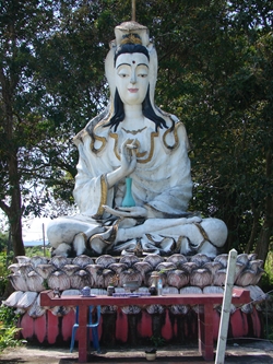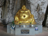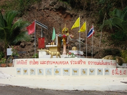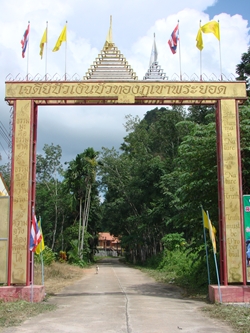 | ホアイヨートからクラビ方面へ行った右の岡(山か?)の上に金色のお寺様のものが見える、入り口がどこかわからない、かなり先にシンプルな門があったので、入って行く、お寺の様な雰囲気だが、管理人らしきおじさんは「ワット(寺)ではない」と言う、マレーシア人が作ったと言っていた、成る程マレーシアって書いてある、入って右に大きな池があって、その向こうには宿泊の為か家が並んでいる、左側には上に登る階段があって、番号がふってある、フウフウ言いながら数を数えながら登らなくてもいいように、親切設計なのだ、でも何段あったか見てくるの忘れた。 |