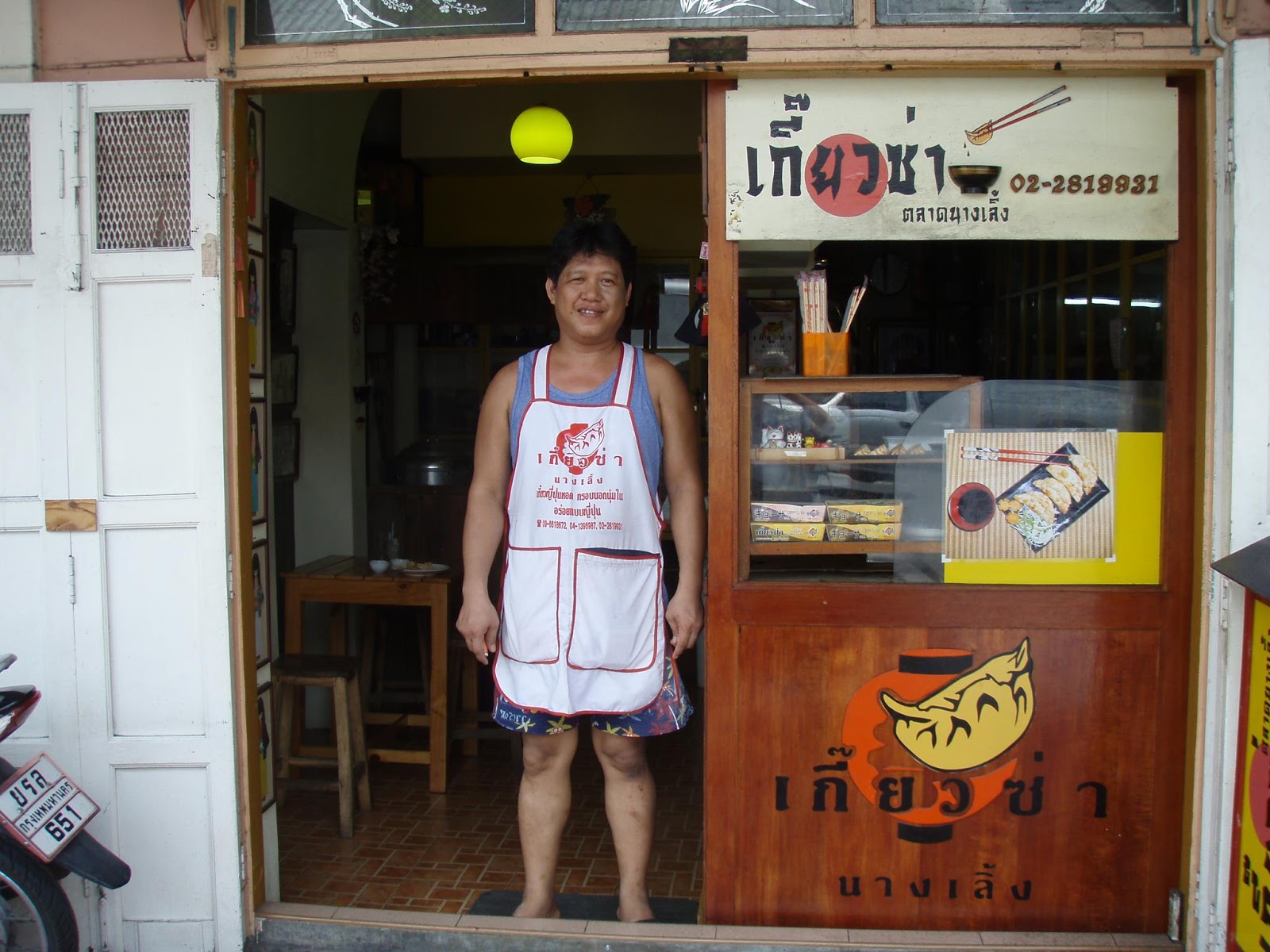 | ナンルン市場入り口(上の写真)向かって右に「ぎょうざや」の暖簾が見えたので写真を撮っていたら中に招き入れられたので色々と話をした、卸売りが主なようで当日も2千個を出したとの事、4種類程あって一皿4~6個で30バーツ程みたいだ、店は小さいが壁にTV取材時の写真が掲げられていて主なチャンネルは全て取材に来ているみたいだ、味は悪くはないが日本のものとの比較は出来ない、タレも何種類かあって甘いマヨネーズもあった、どういう理由でTVが取材に来たのかは聞き漏らした。 | |