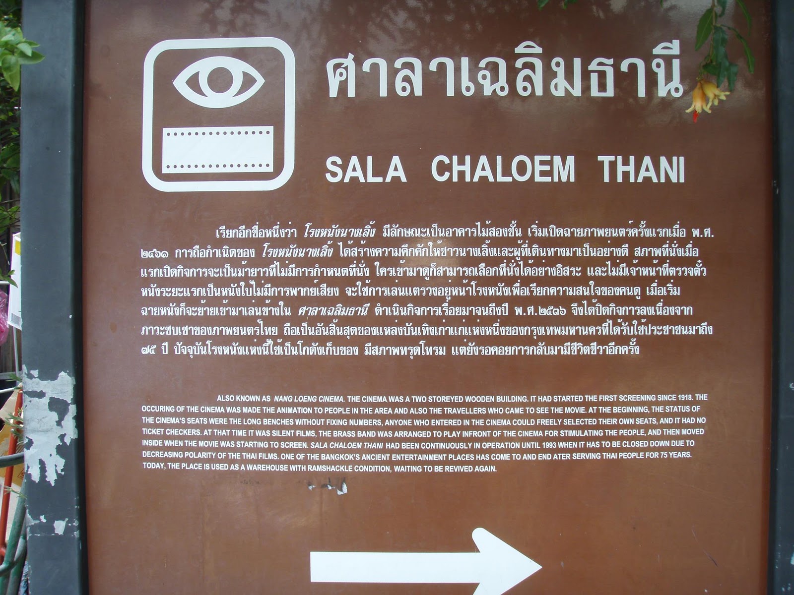 | さて、タイ最古の映画館だが1918年~1993年までの75年間営業していたらしい、本当に最古なのか近所の人達に尋ねてみた、そうだと言う人もいれば、もっと古いのもあったんじゃないのと言う人もいた、結局現存する映画館では一番古いと言う事になったようで、タイ最古の映画館なのかは私には不明、現在は倉庫のような使われ方をしているらしい。 | |