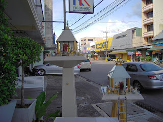 トランの町で見かけたサンプラプームとサンジャオ、タイ国中にあるんだろうけど、こんな作りの物は初めて、ガラス板を組み合わせており、フェンスもガラス板、まあ神様も近代的な家に住みたいのかも。 |