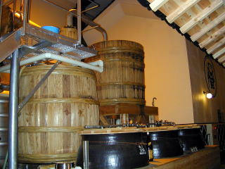 | ここも昔ながらの木桶蒸溜器があります。 木桶蒸溜器は大変希少品で、作る職人さんが 鹿児島で1人しかおらず、製作に1つ約1年 かかるそうです(^^; 鹿児島県内の蔵元でも5箇所ぐらいしか 無いそうです。 |