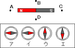 A〜D点に方位磁針を置いたとき、針の向きはア〜エのどれになるか。