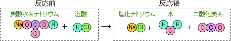 【例】炭酸水素ナトリウムに塩酸を加えると塩化ナトリウムと水ができ、二酸化炭素が発生