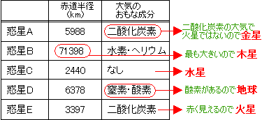 金星の大気が二酸化炭素であることか、水星の大気がないこと、あるいは水星がこの5個の中で一番小さいことを知っていればあとは決定できますね。