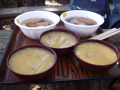 なめこ汁とおでんを持って二人が戻って来た。暖かい!やっとお弁当が食べられる。わ〜い!