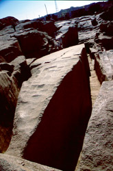 切りかけのオベリスク 古代から使われていた花崗岩の石切り場にあり、亀裂が 入ったため放置された。完成したら全長42m、重さ1150 トンに及ぶ最大のオベリスクになる筈であった。 |