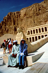 断崖絶壁を背にして建つハトシェプスト女王葬祭殿 茶褐色の岩壁と真っ青な空の色とのコントラストが 鮮やかでした。 |