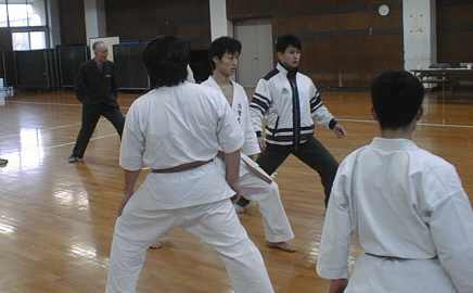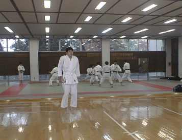 | 剣道場を借りての練習開始 | 賀数君の後ろで練習しているのは少林寺です。 |