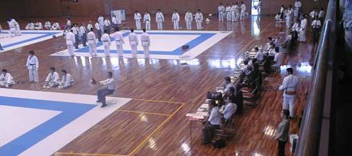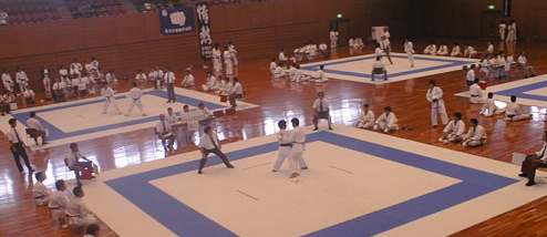 | 副将:大野(1年) 二段 近接戦を戦う(左) インターハイで型 全国8位を 取った大野も 本大会でベスト4迄行った 熊本学園大の副将には苦戦。 |