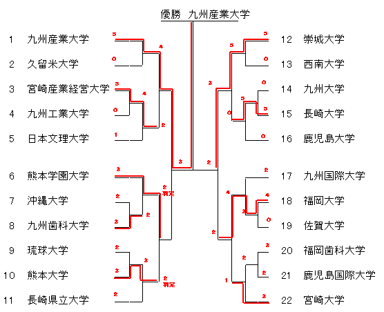 男子 九州産業大学 九州産業大学 九州産業大学 九州産業大学 九州産業大学 崇城大学 崇城大学 崇城大学 福岡大学 熊本大学 女子 九州産業大学 九州産業大学 九州産業大学 福岡大学 福岡大学 九州国際大学 熊本学園大学 |