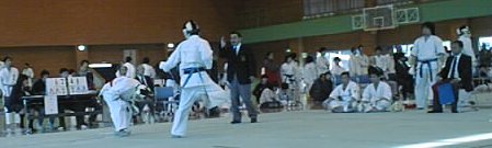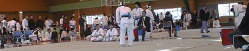 またもや高田君の蹴りが相手の腹部に入りました。 これで2回目の反則を取られ 高田君は0−2で 敗退です。 |