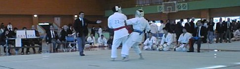 [右写真] 1回戦開始 右側:先鋒の岡本先輩 [下写真] 格闘中の岡本先輩 6−0で 岡本先輩が勝利を収めます |