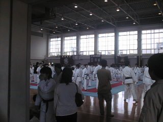 | 体育館内の道場で調整する佐大チーム | 9:30 開会式の召集がかかりました。 |