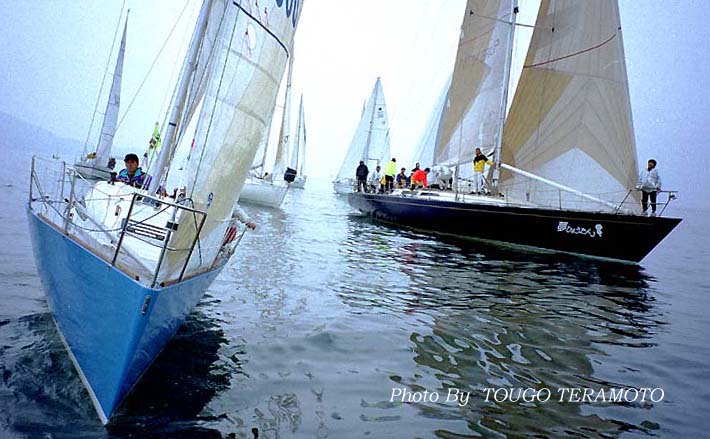 | WOYCの新星「航生」のデビュー戦は、微風との戦い、さらにオープン参加の 関西のファーストホーマー「夢ひょうたん」との戦いとなった 高井理設計28ftのレーサー「航生」が滑るように海面を進んでくる。 そのすぐ後ろから68ftの巨体の「夢ひょうたん」がじりじりと追い上げてくる この第1レースは「夢ひょうたん」が着順1位、「航生」が着順2位 総合では「航生」が1位を獲得した |